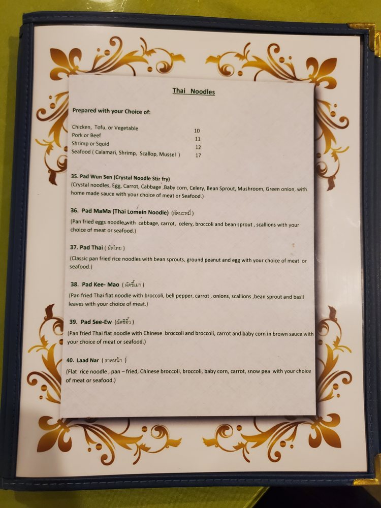 Pan fried Thai flat noodle with Chinese broccoli and broccoli, carrot, egg and baby corn in brown sauce with your choice of meat or seafood.